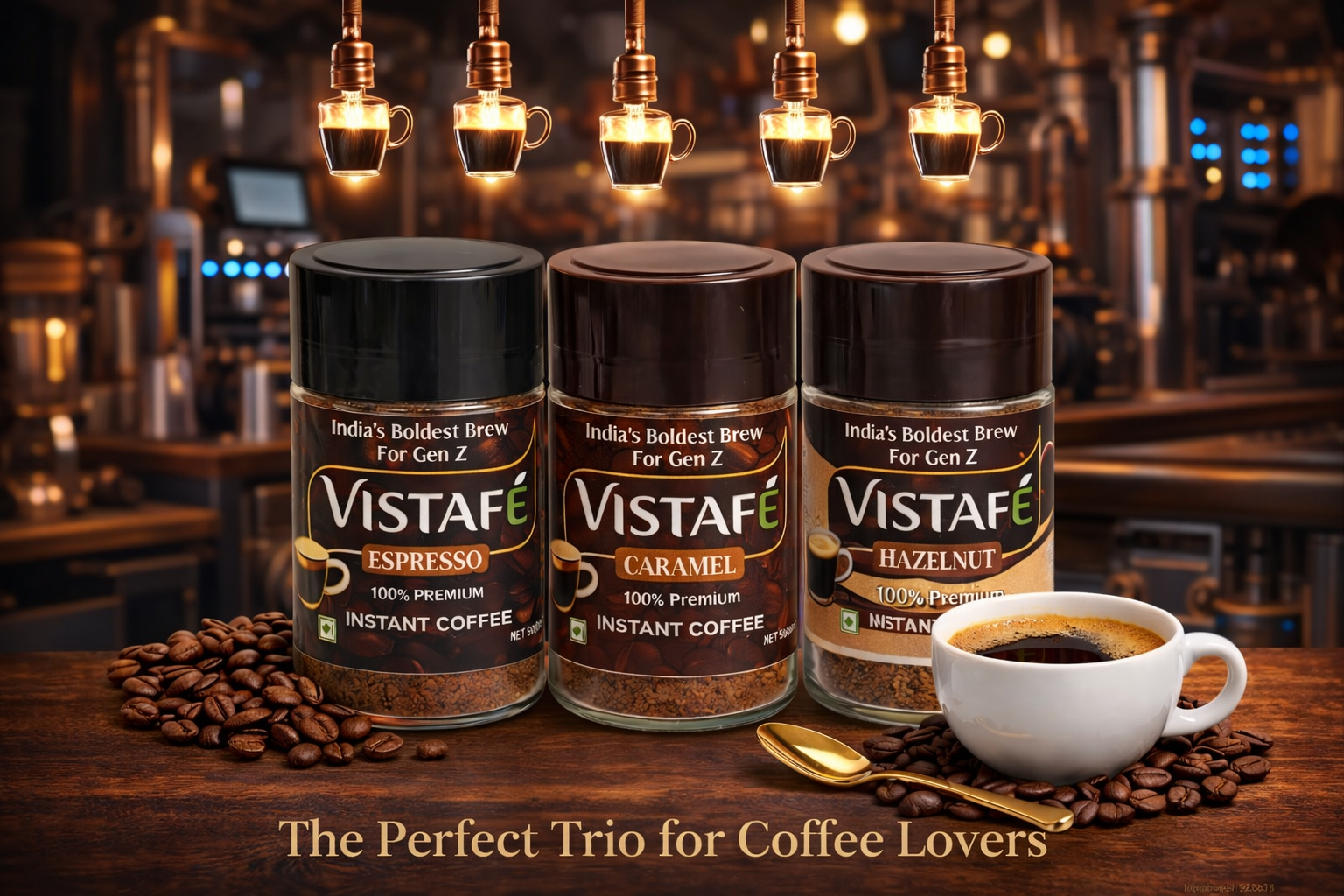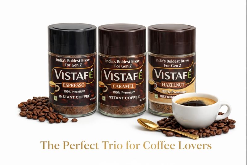 Introducing Vistafé’s premium instant coffee combo pack – India’s Boldest Brew crafted specially for Gen Z coffee enthusiasts. This exquisite collection features three distinctive flavours: a rich Caramel blend, aromatic Hazelnut and intense Espresso, each carefully crafted from 100% premium Arabica beans. Each flavour comes in a convenient 50g jar, perfect for exploring different coffee experiences. The instant coffee dissolves seamlessly, delivering a café-style beverage in moments. Whether you prefer the sweet notes of caramel, the nutty essence of hazelnut, or the bold kick of espresso, this combo pack offers something for every coffee moment. These sophisticated flavours can be enjoyed hot or cold, making them versatile for any season. The sleek, dark brown jars not only preserve the coffee’s freshness but also add a touch of elegance to your kitchen counter. Perfect for coffee lovers who appreciate quality and convenience in their daily brew.