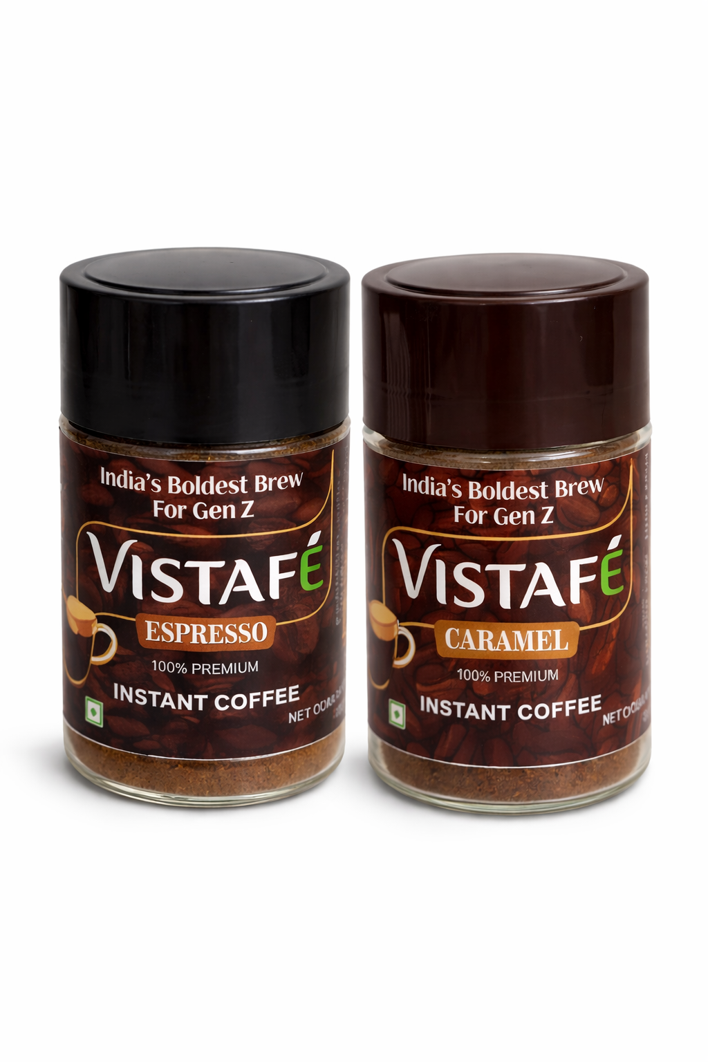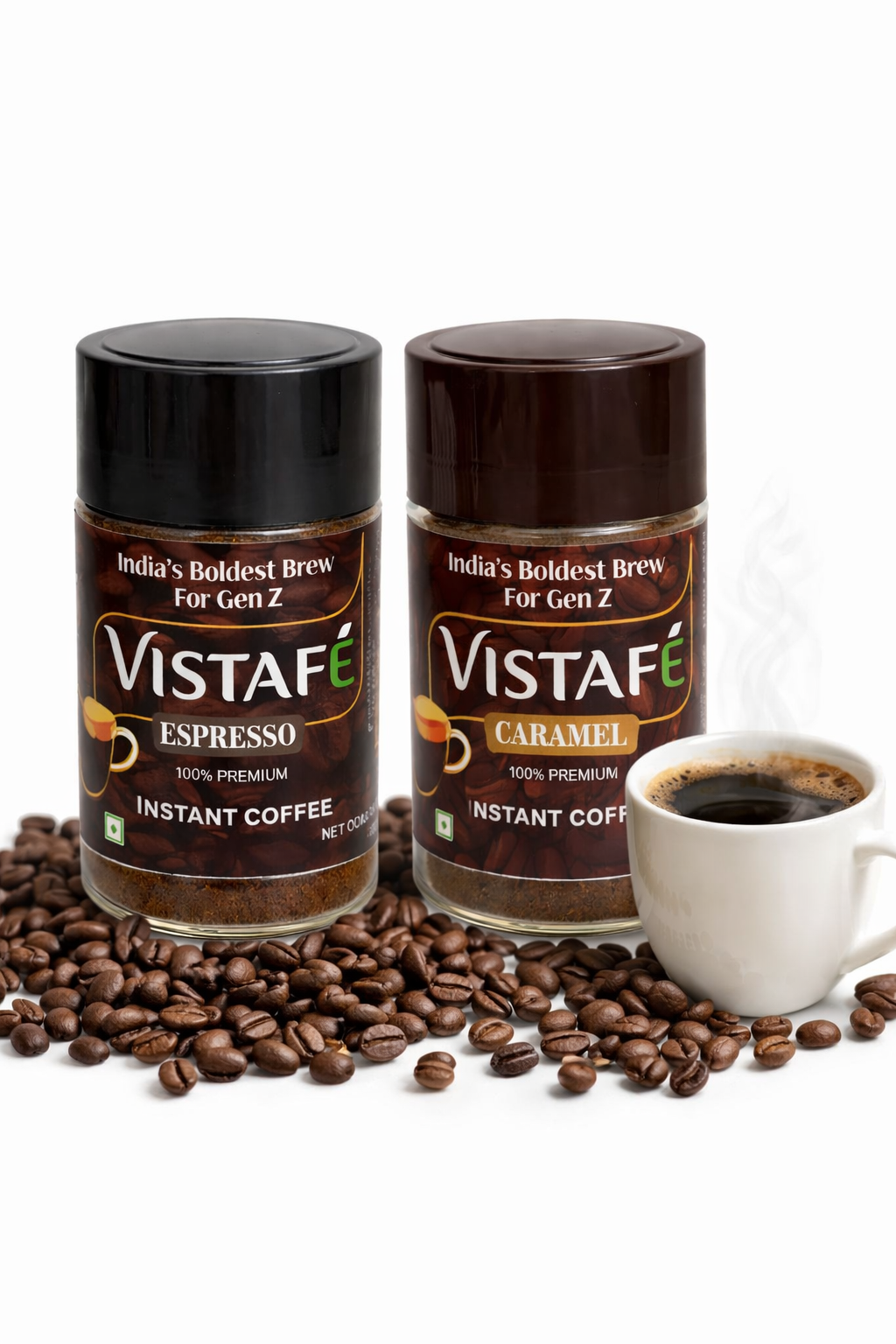 Experience variety in every cup with the Vistafe Espresso & Caramel Combo, featuring two distinct coffee styles in one convenient pack. The Espresso delivers a bold, strong and intense coffee flavour—perfect for black coffee lovers and those who need a powerful caffeine kick. The Caramel variant offers a smooth, mildly sweet taste with rich aroma, ideal for creamy and indulgent coffee moments. Crafted from premium-quality coffee beans, both blends dissolve instantly to give you a consistent, café-style experience at home or work. Whether you prefer your coffee strong and energizing or smooth and comforting, this combo lets you enjoy the best of both worlds.